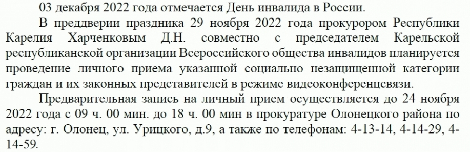 Личный прием прокурором Республики Карелия совместно с председателем Карельской республиканской организации Всероссийского общества инвалидов
