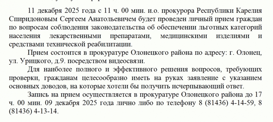 / 11 декабря 2025 года и.о. прокурора Республики Карелия Спиридоновым Сергеем Анатольевичем будет проведен личный прием граждан